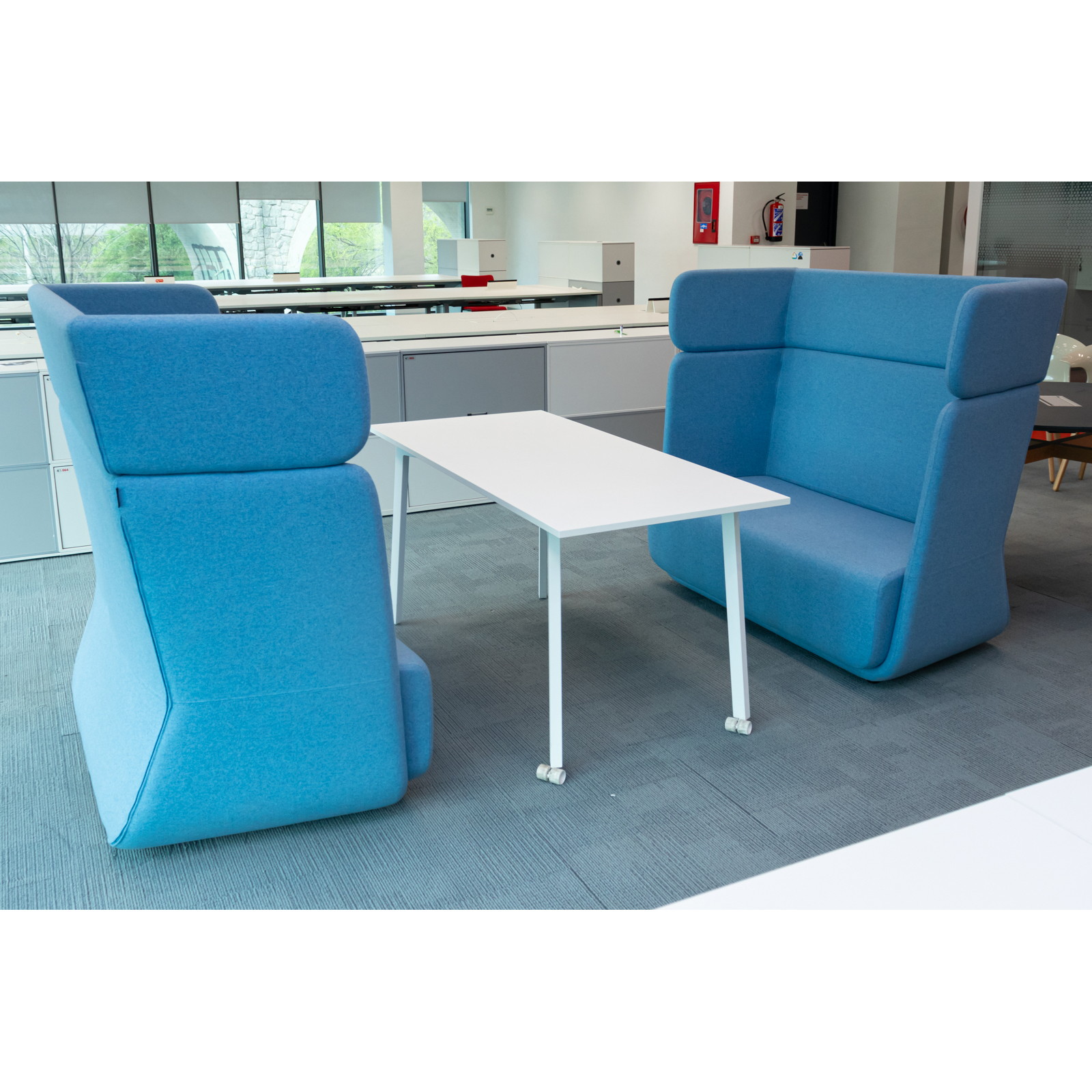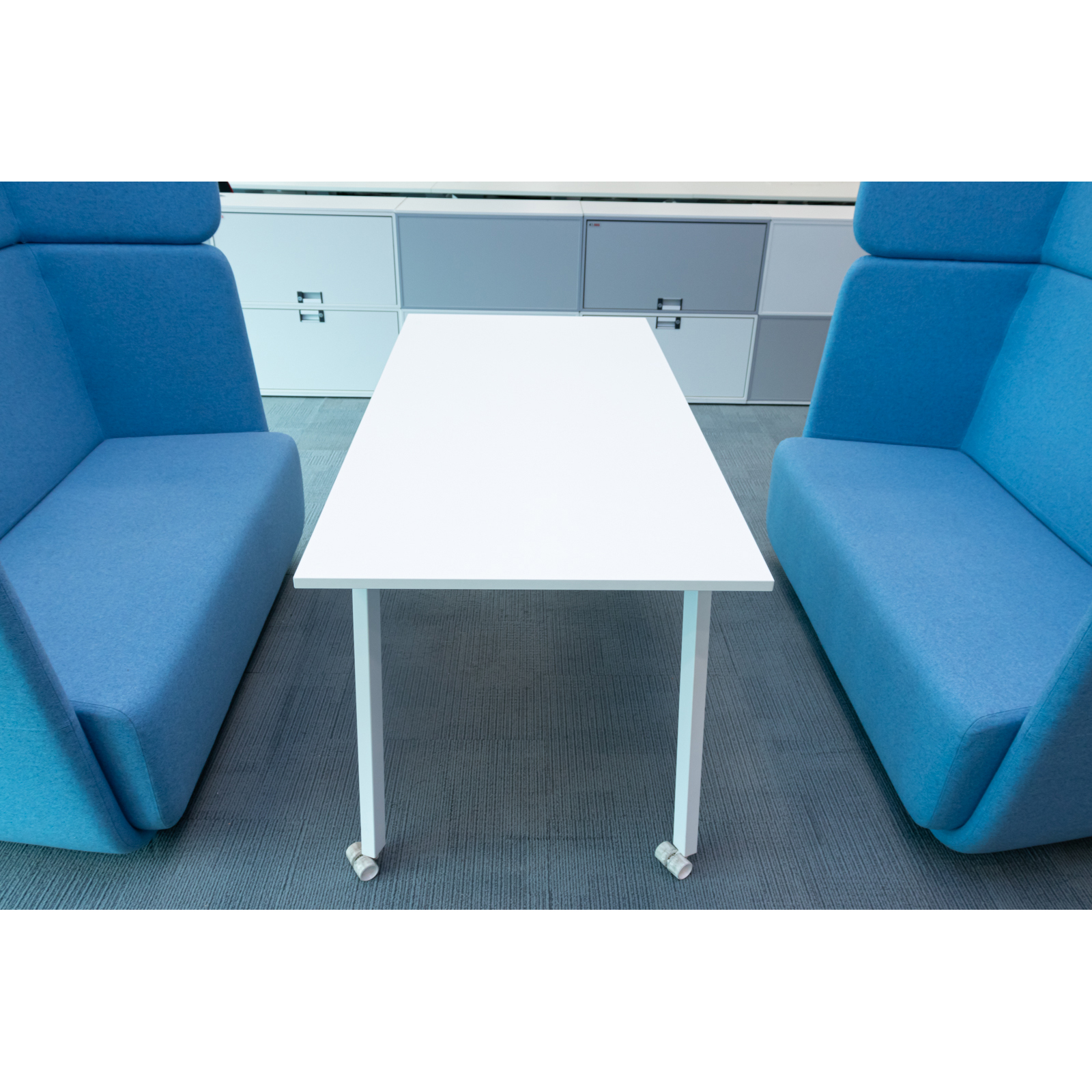 Conjunto de Sillones Azules con Mesa Blanca – Elegancia y Armonía para tu Espacio