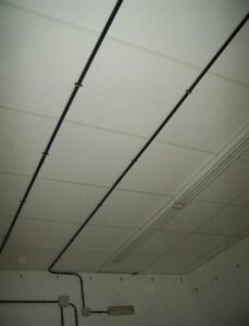 total de 3,57 m. Sus acabados son de terrazo grano fino en suelo, temple liso en paredes y falso techo de escayola con placas desmontables,