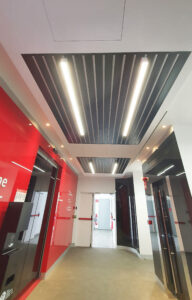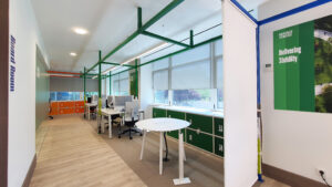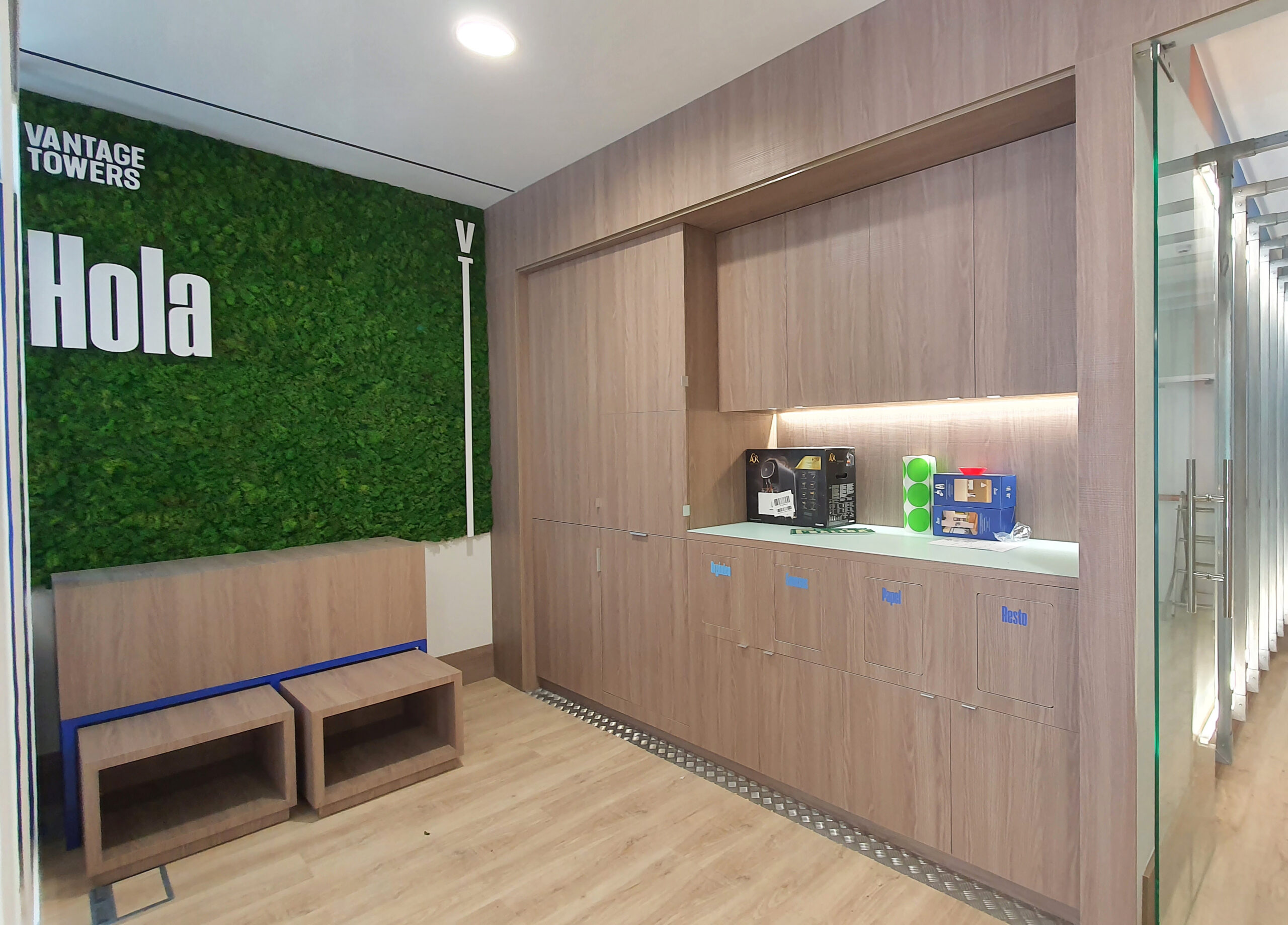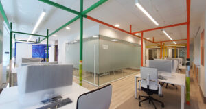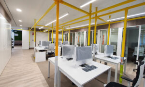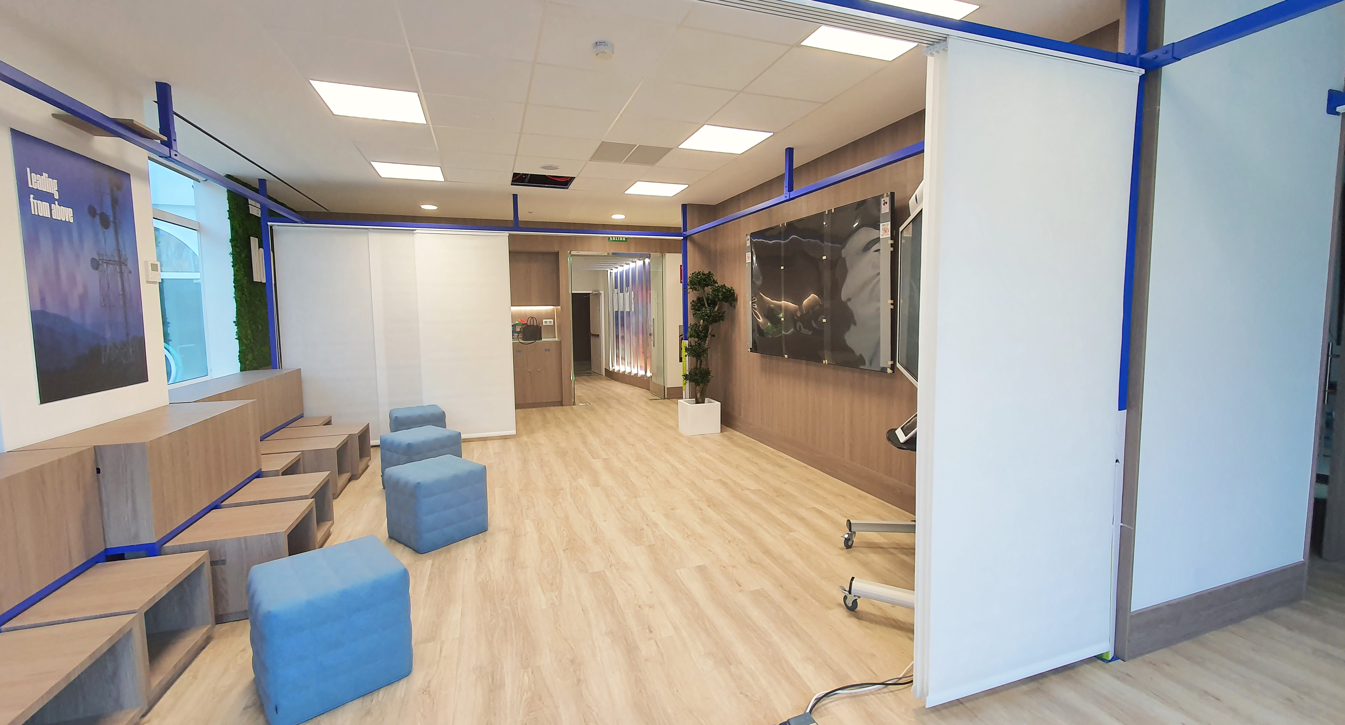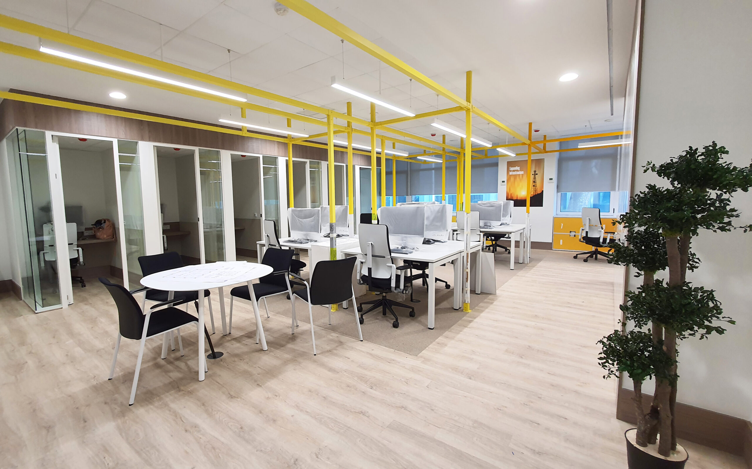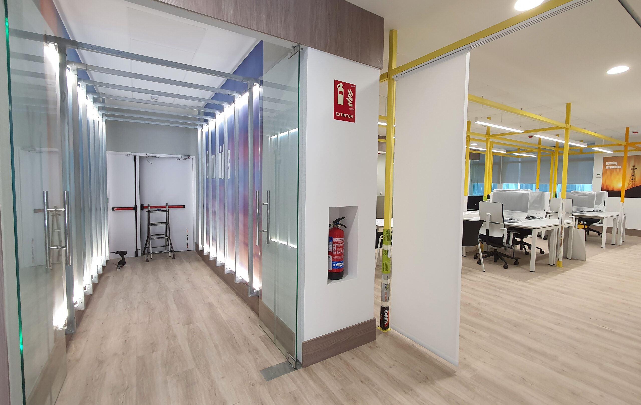 La oficina destaca por su luminosidad, la amplitud visual generada por sus cerramientos acristalados y la calidad percibida de sus acabados. Los espacios de trabajo abiertos, las zonas de encuentro y los elementos de almacenaje integrados crean un ambiente ordenado, actual y perfectamente alineado con una imagen corporativa contemporánea.