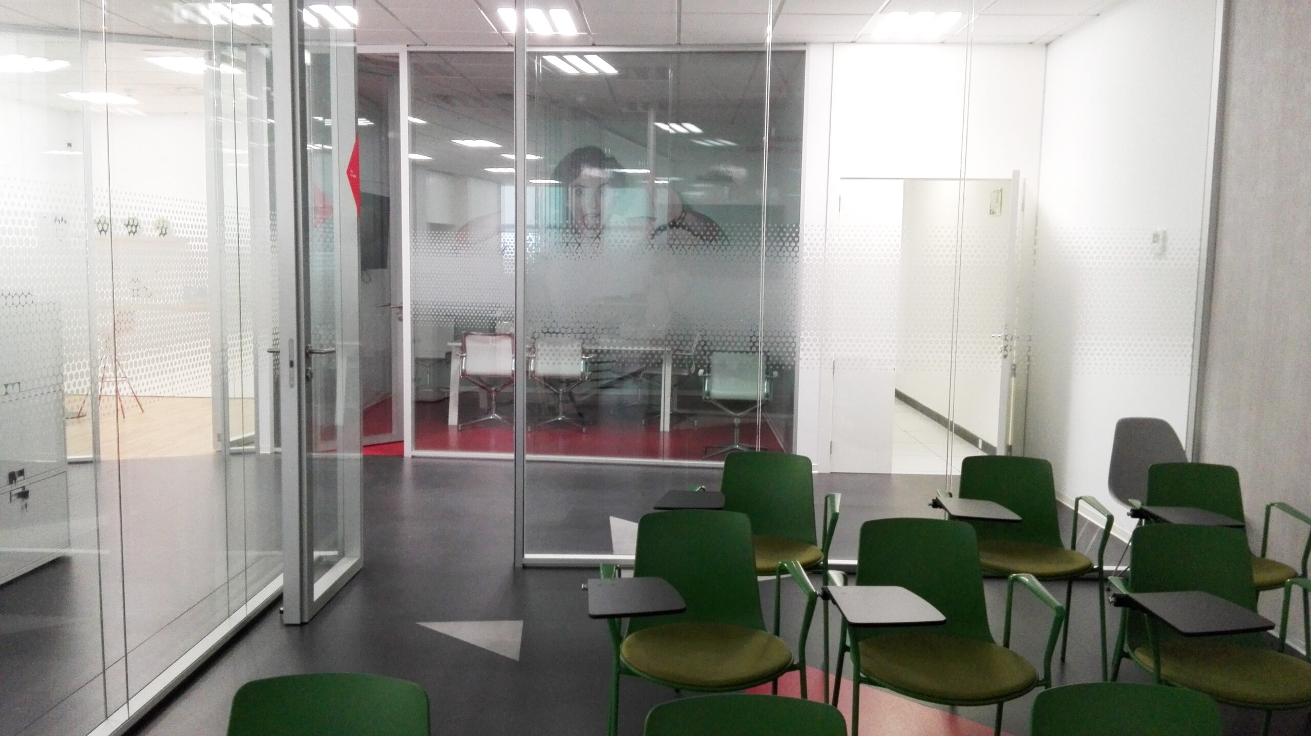 En el interior se aprecia una imagen moderna y profesional, con espacios diáfanos, cerramientos acristalados que aportan amplitud visual y una configuración que favorece tanto la operativa diaria como la organización de presentaciones, reuniones o formaciones. La zona de formación, equipada para uso colectivo, añade un valor diferencial al inmueble, mientras que las salas acristaladas y zonas comunes refuerzan su carácter práctico y corporativo.